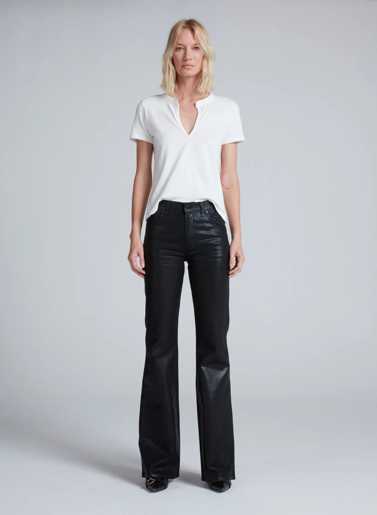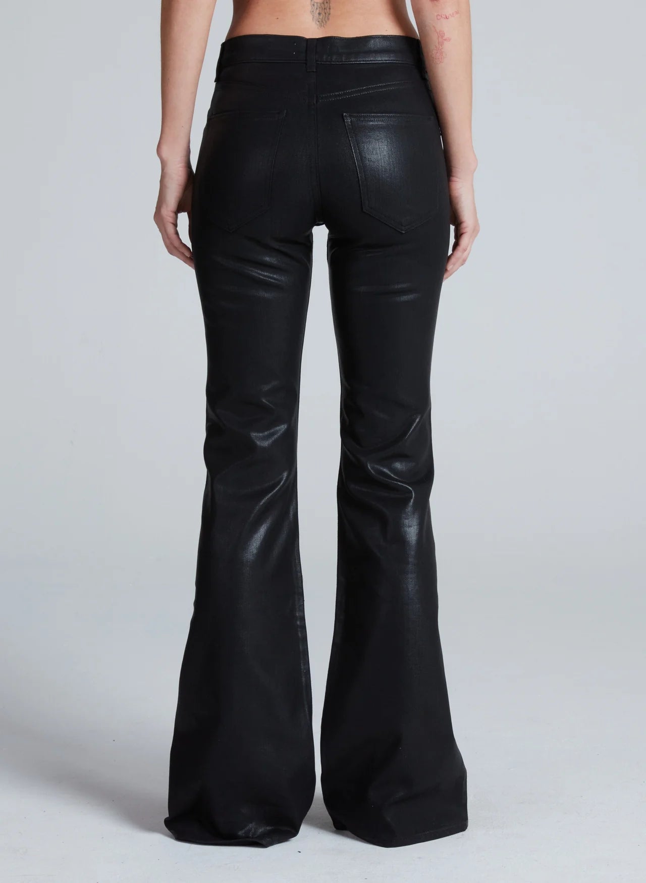 The Bond Street is a sleek, full-length flare designed with a mid rise, slim fit through the hips, and dramatic flare from the knee down. Finished in a coated black Japanese stretch denim, it delivers a polished, leather-like look with the comfort and flexibility of denim. A bold, statement-making jean that transitions seamlessly from day to night.