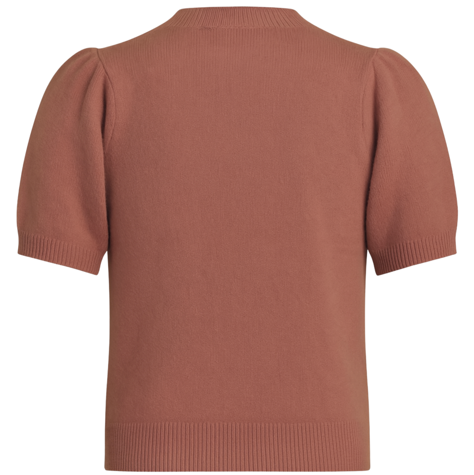 A short sleeve jersey-stitched cardigan in luscious 100% cashmere knit for soft structure. Slight puff sleeve. Refined by ribbing at crewneck, cuffs, and hem.