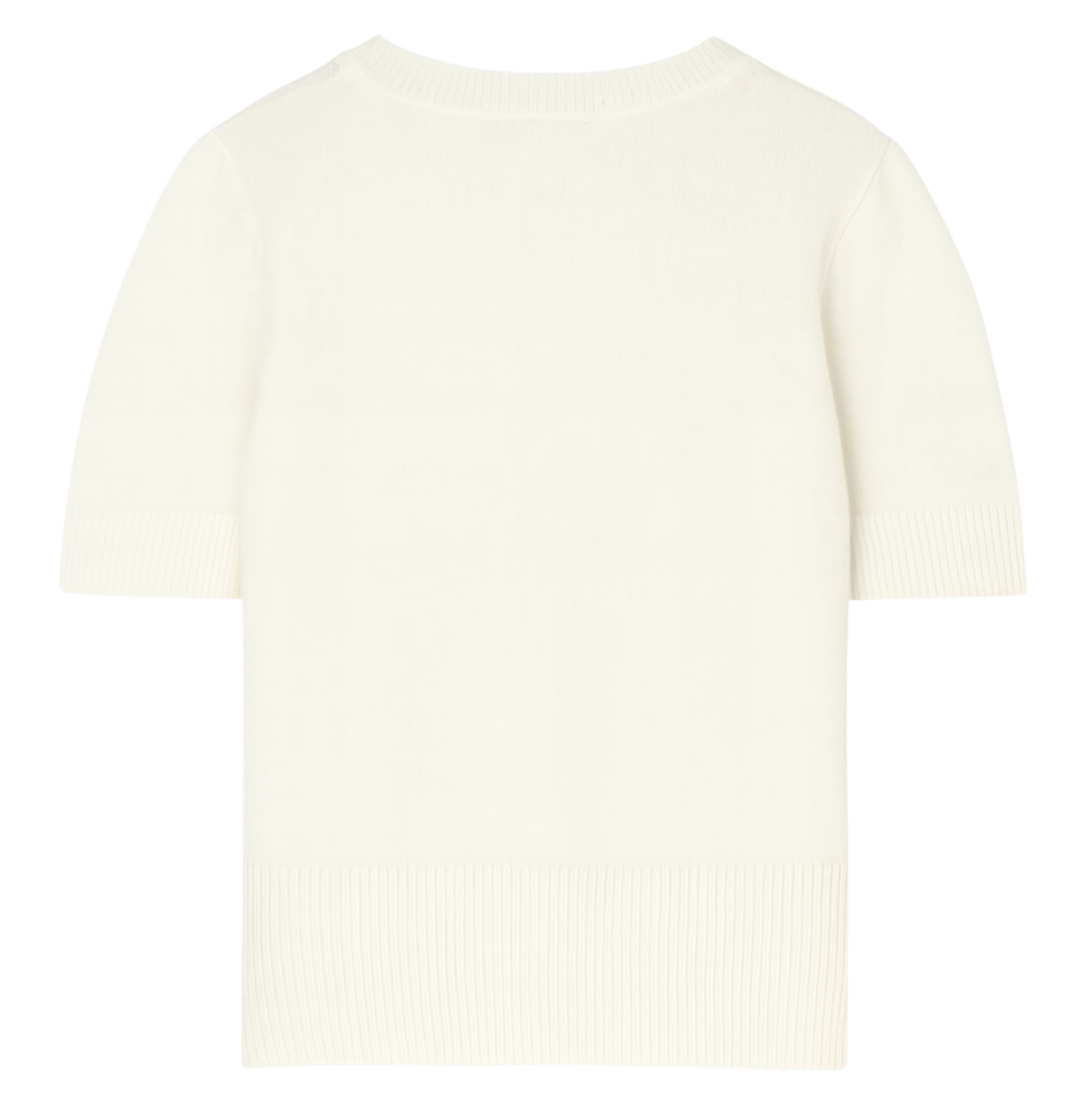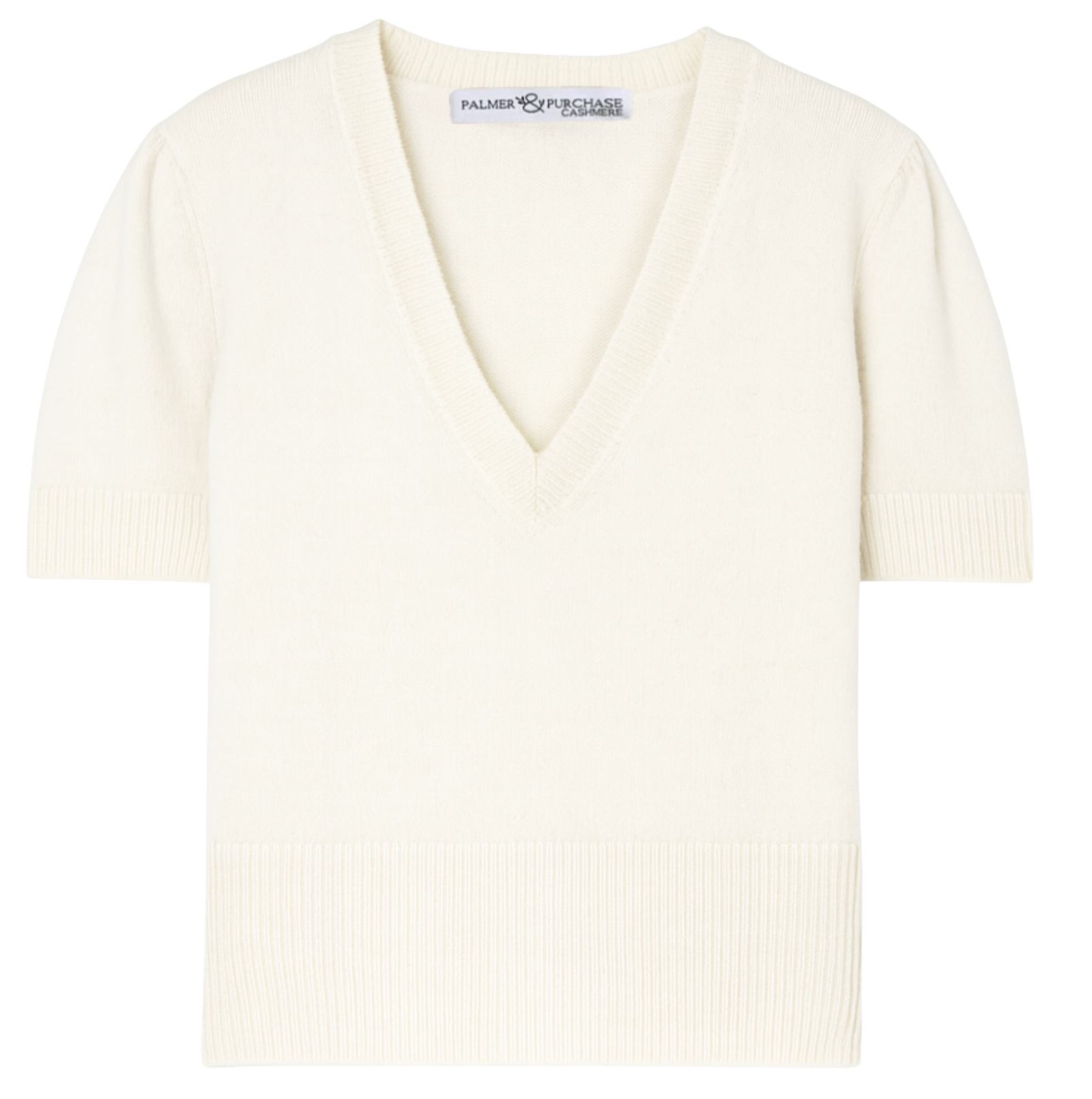 A short sleeve V neck pullover in luscious 100% cashmere knit for soft structure. Slight puff sleeve.  Refined by ribbing at crewneck, cuffs, and hem.