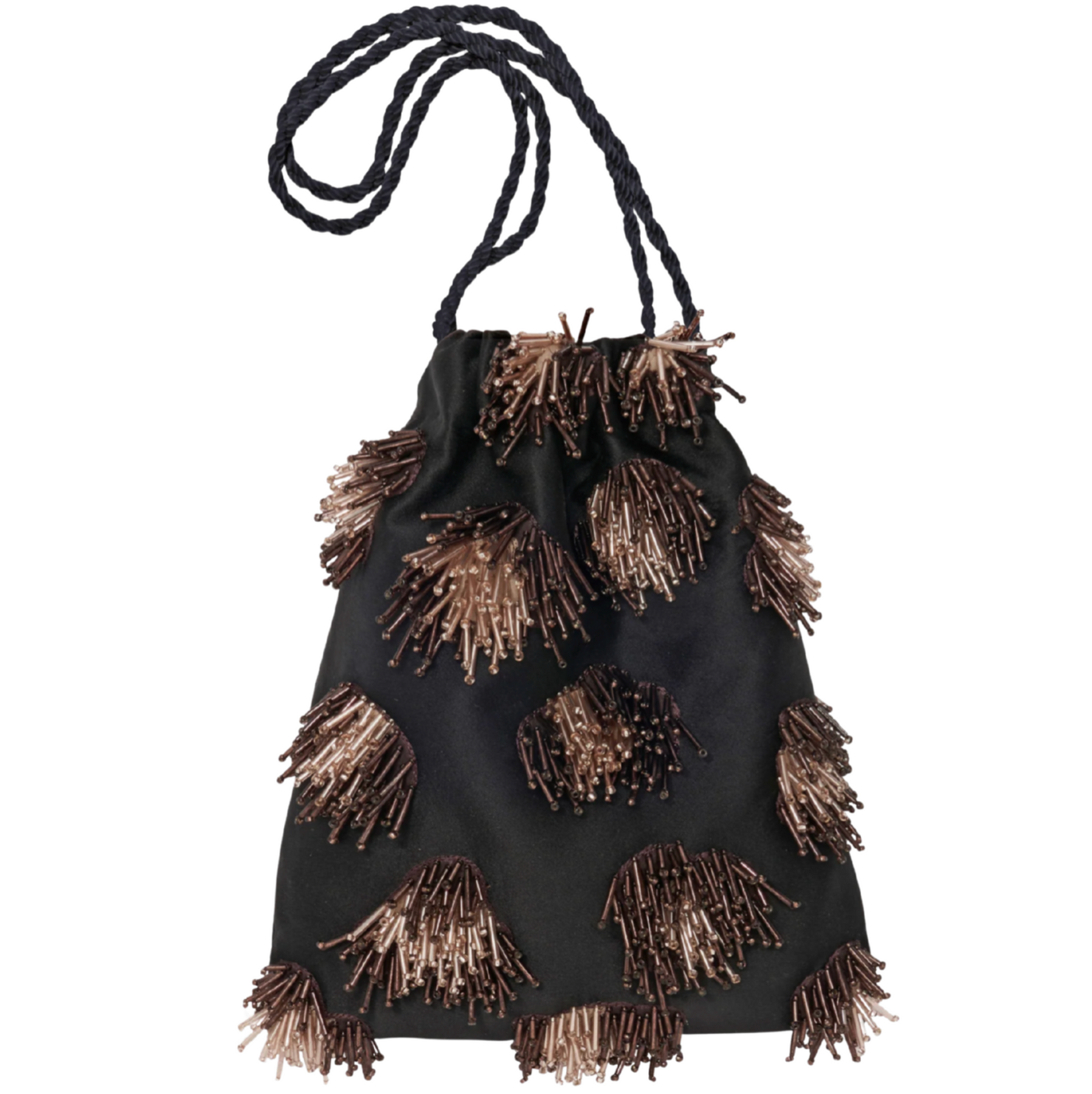 or all your major nighttime moments, go dramatic in a black silk evening bag with bronze-toned, hand-beaded embellishments and black silk twist cord wristlet.