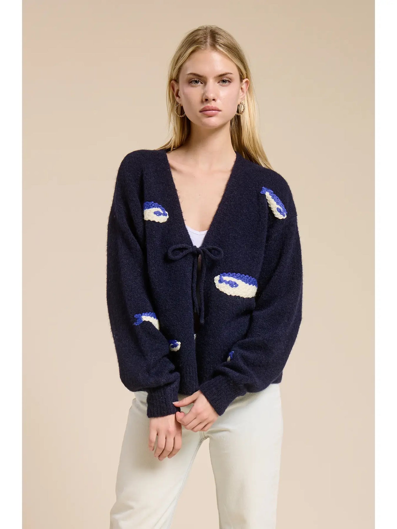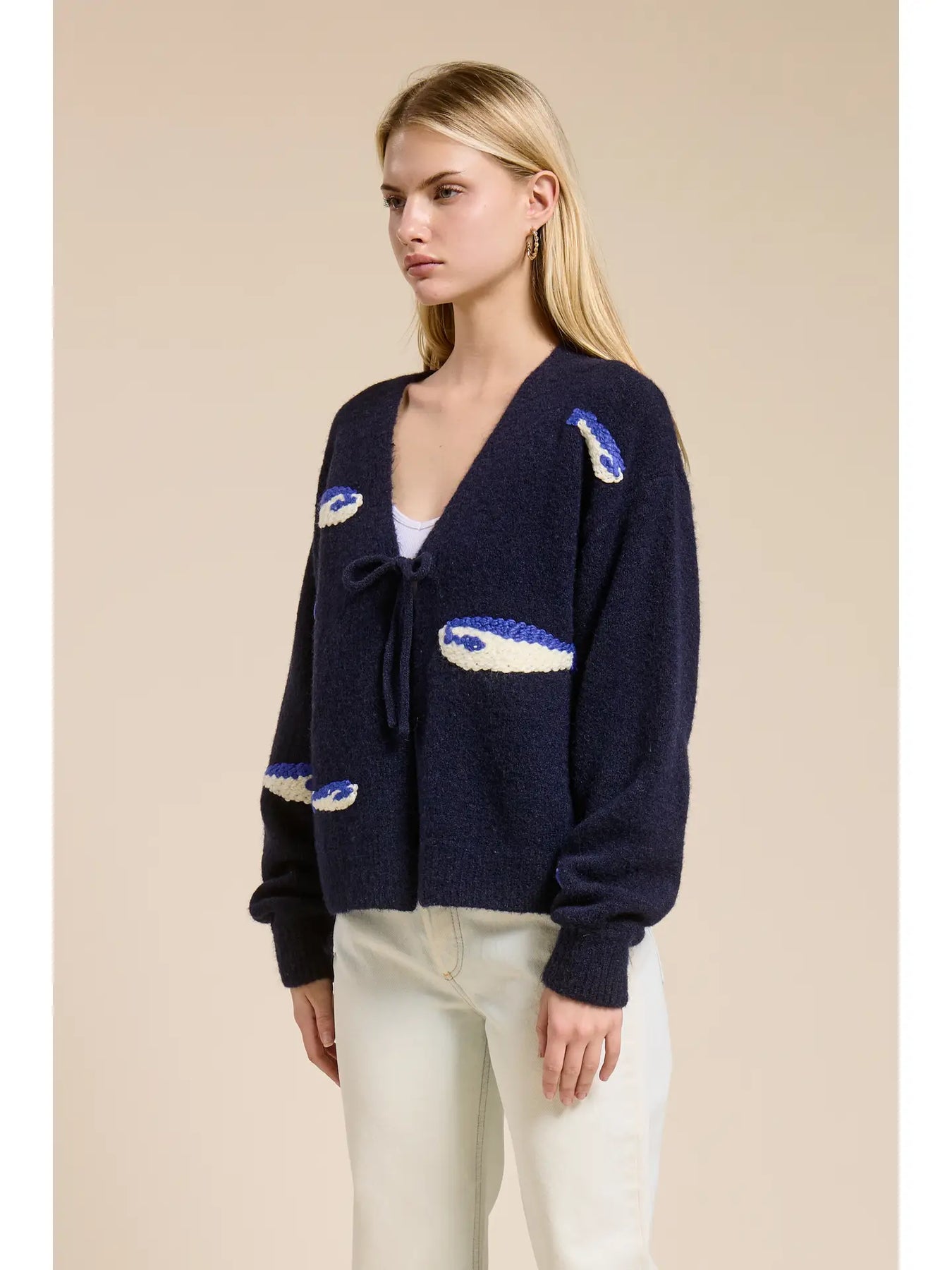 A cozy navy cardigan finished with a tie-front closure and playful knit motifs, offering a soft, relaxed layer with a touch of charm.