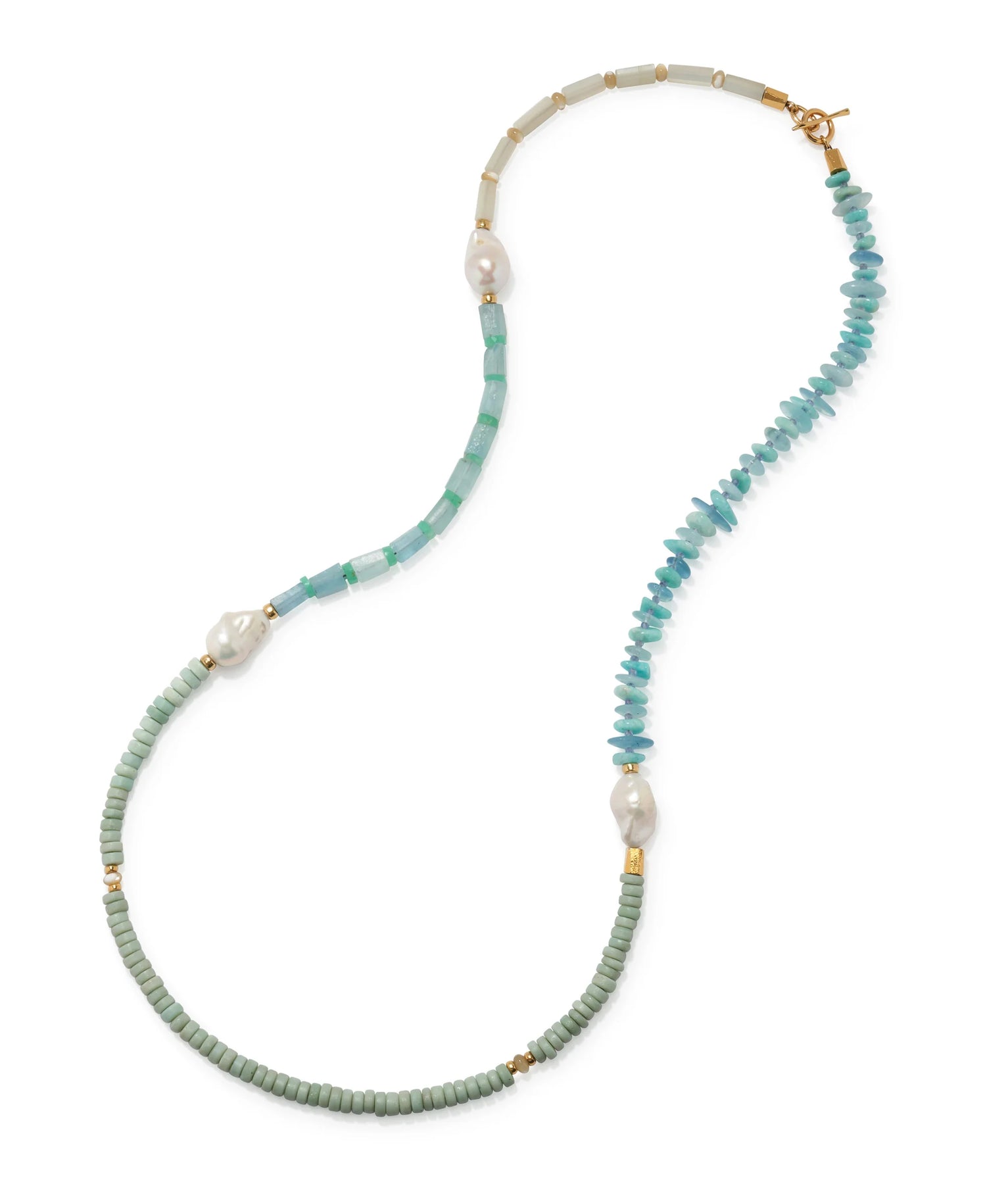 The flora of the American Southwest is one of our true evergreen inspirations, and this Cabana colorway is proof. Featuring color-blocked beads of faceted white moonstone, aquamarine, amazonite, and pastel green glass, with tanzanite, chrysoprase, mother-of-pearl, and freshwater pearl accents. This necklace can be worn long or doubled around for a cool collar effect.