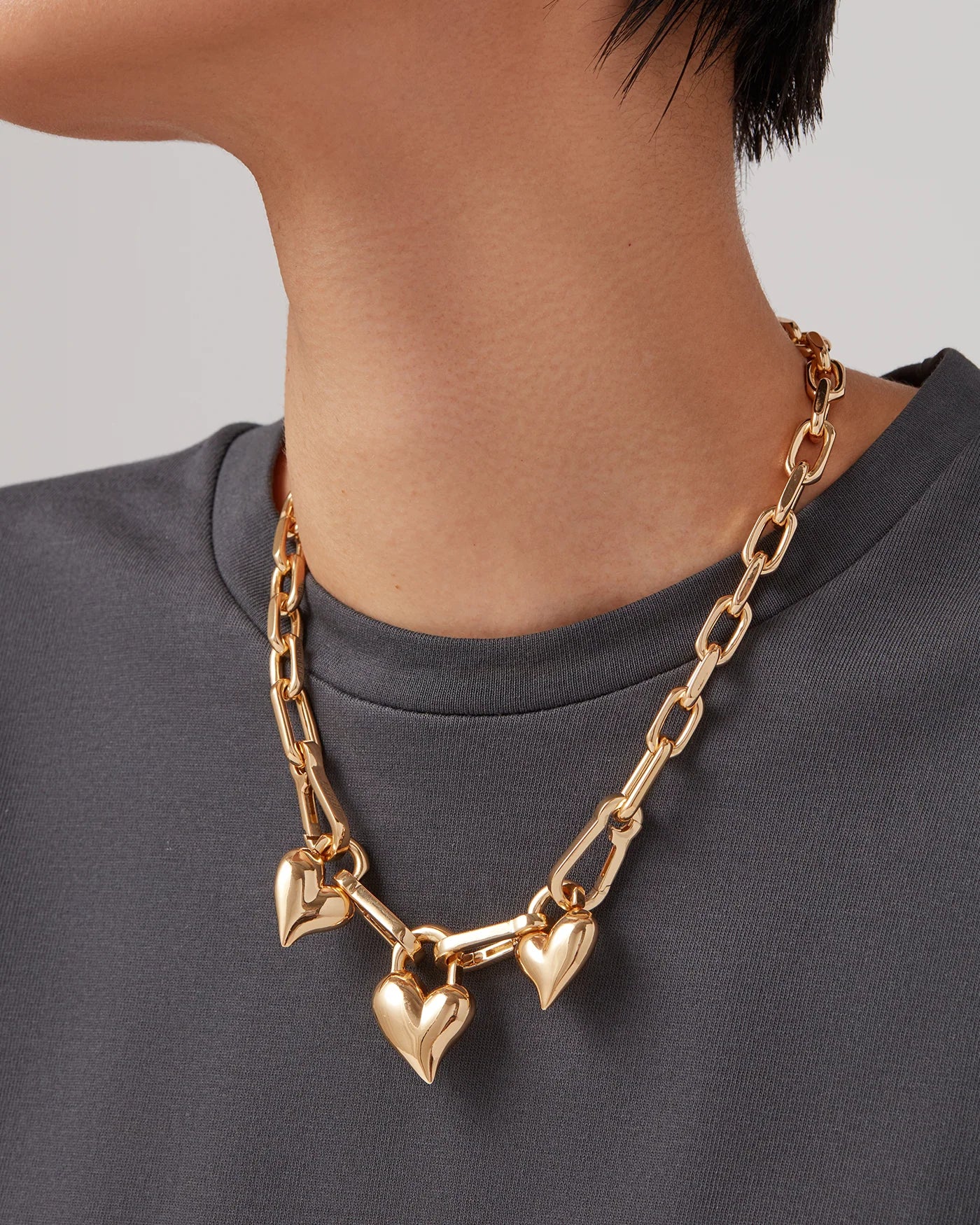 Three removable hearts are hooked onto crisp, faceted links. Play around with this chain to achieve different looks: remove one, two or all three hearts using the mini carabiner clasps, or split the chain in half to use it as a bag charm or keychain. Finished in high-polish gold.
