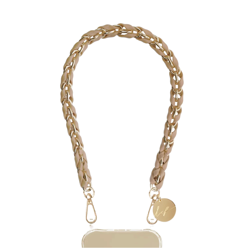Our Lou phone chain is a timeless essential. Hand-braided from vegan leather and stainless steel, it combines flexibility and structure. Its metallic sheen and herringbone braid give it a jewelry-like look, elegant for everyday wear.