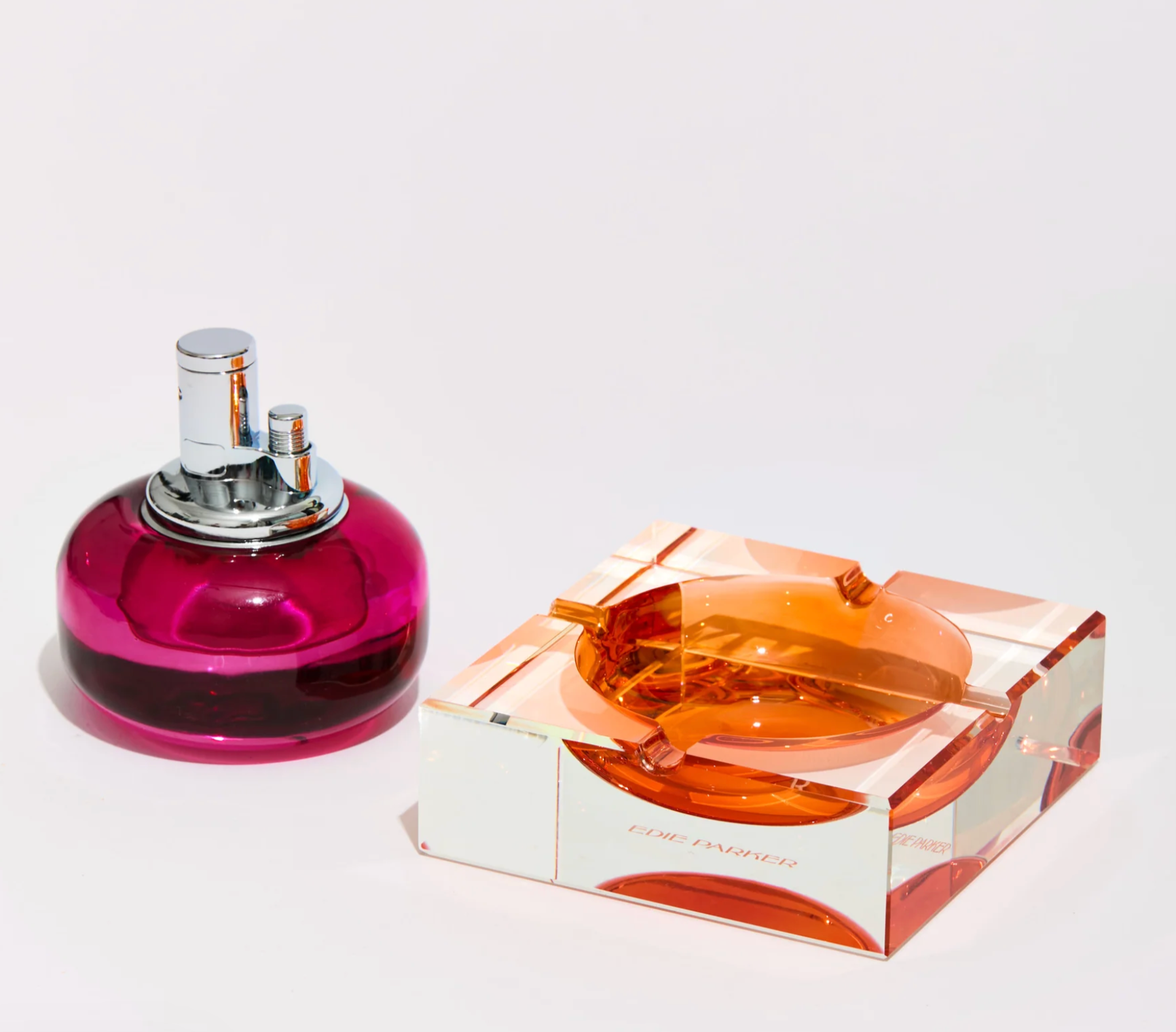 Nested, two-piece glass tabletop lighter and illusion base ashtray with 4 rests, designed to sit together or apart. They're not just home accessories; they're conversation starters! Made of both molded and cut glass, paired with a high shine chrome torch lighter insert, bask in the mesmerizing glow of these candy colored, geometric glass sets.