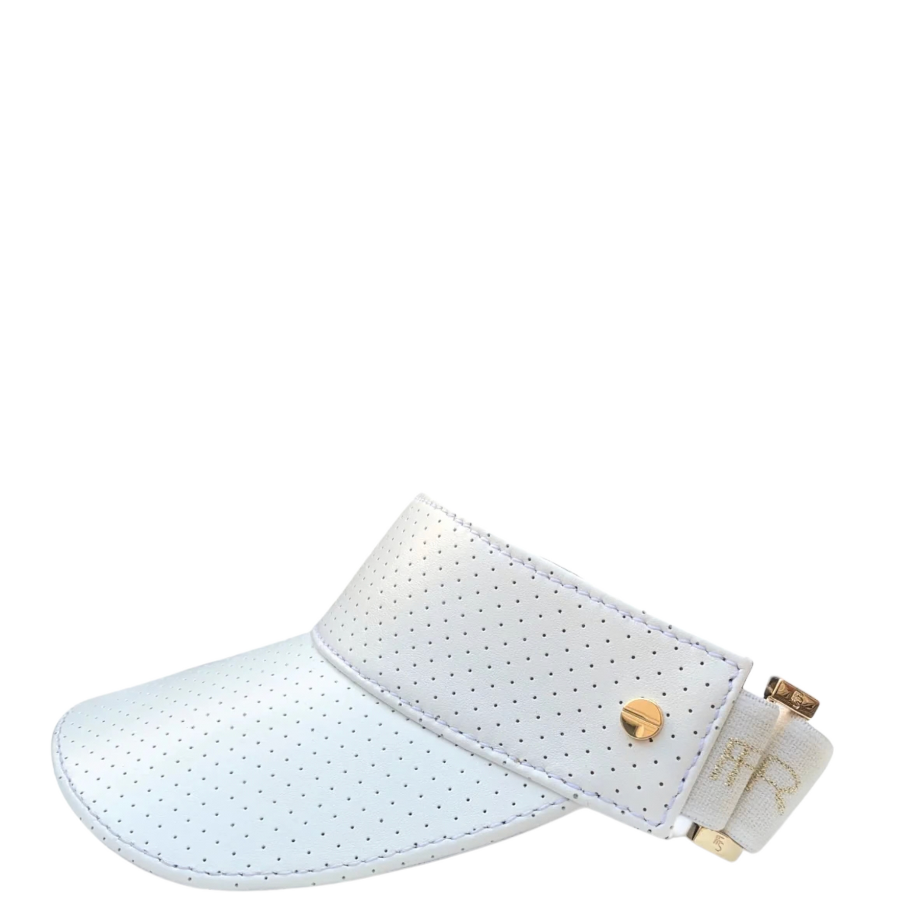 Our signature perforated leather lines the exterior of this chic visor, which is functionally lined on the interior with a moisture-wicking Dri-Weave material. It wears most comfortably with a super-soft, luxe elastic back strap that can be adjusted with our signature luxe sliders.