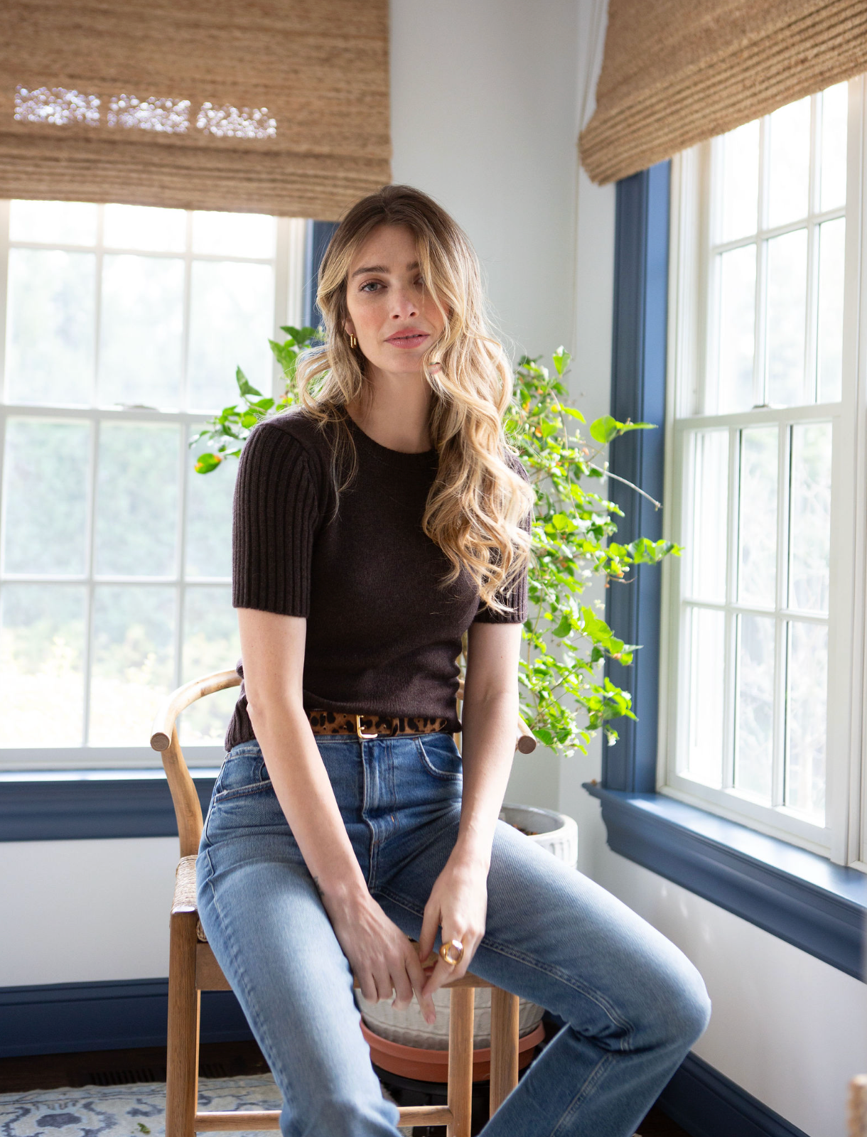 A fitted, short sleeve pullover in luxurious cashmere. Elbow-length sleeves and dimensional ribbing at crewneck and hem. Wear back to an oversized pant or denim. Pairs perfectly with a-line shirts.