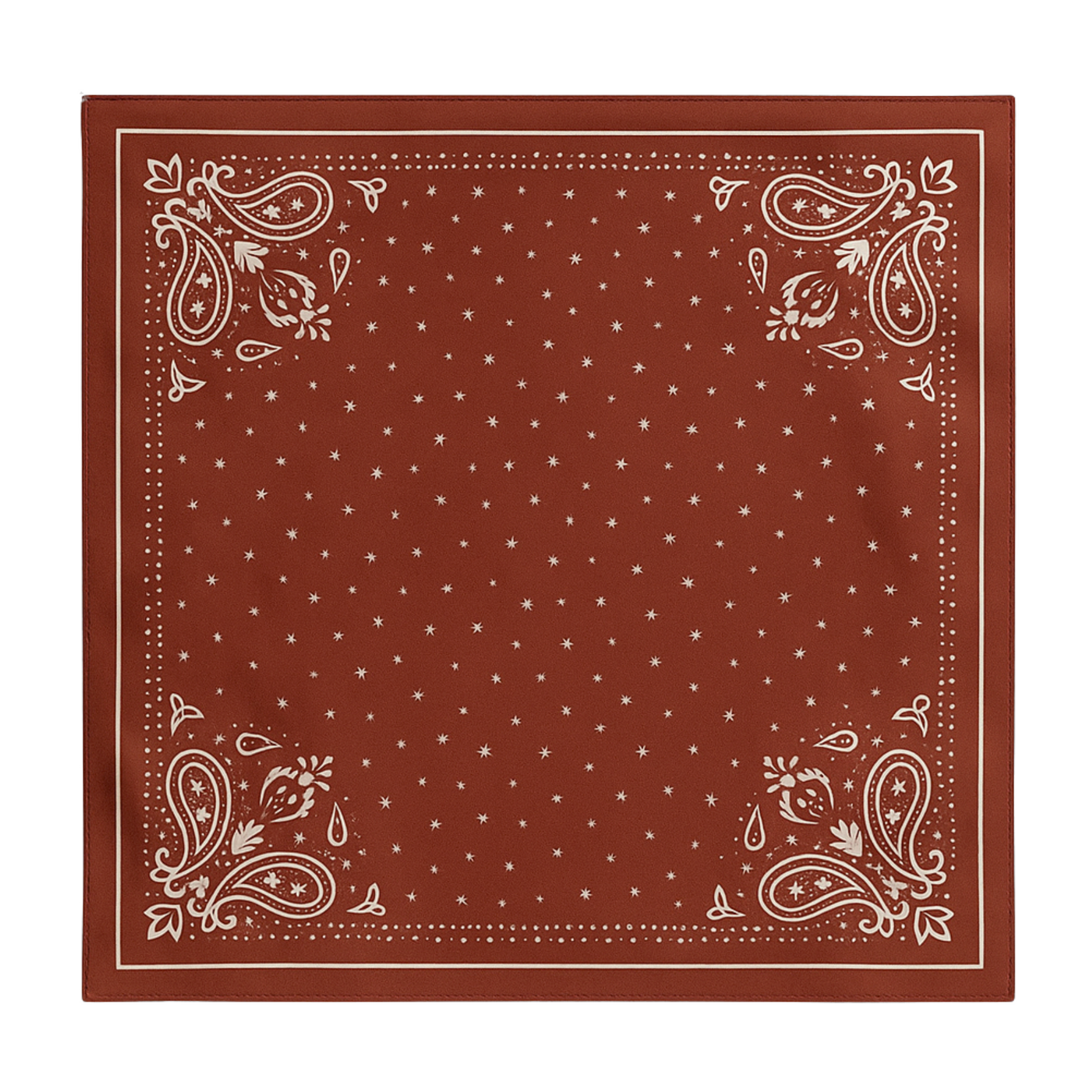A rich brick-red silk square scarf featuring an intricate bandana-inspired print. Soft, lightweight, and effortlessly chic—perfect for tying at the neck, in your hair, or on your favorite bag for a polished finishing touch.