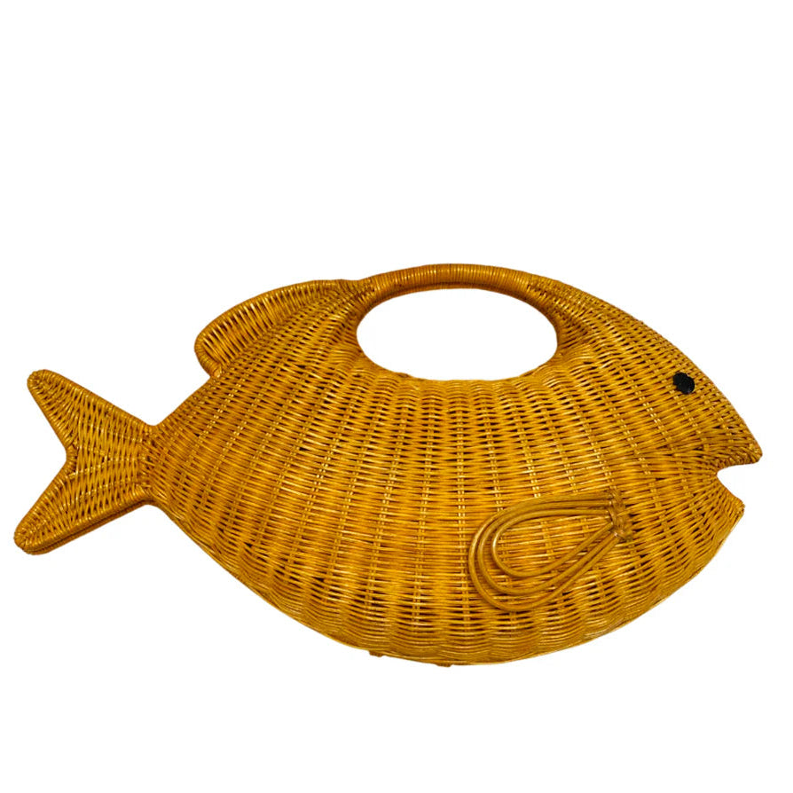 Daniel Fish Light Honey bag made of natural wicker in a fish shape. Polyester lining. Magnetic snap closure. Wicker handle detail. Includes a long metal chain strap.