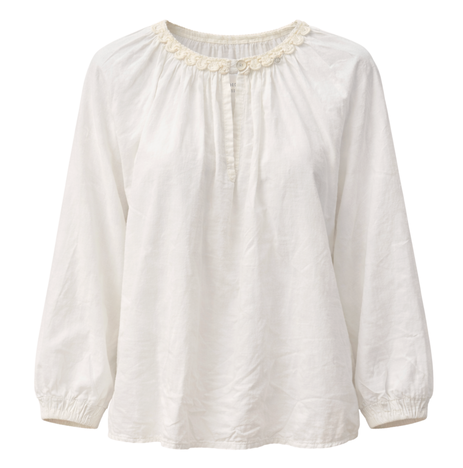 Designed with an easy, fluid silhouette, this blouse features a softly gathered neckline accented with delicate embellishment for a subtle touch of texture. The split-neck opening adds effortless polish, while the lightweight fabrication drapes beautifully for all-day wear. Finished with gently billowed sleeves and elasticized cuffs, it’s an elevated essential that transitions seamlessly from work to weekend.