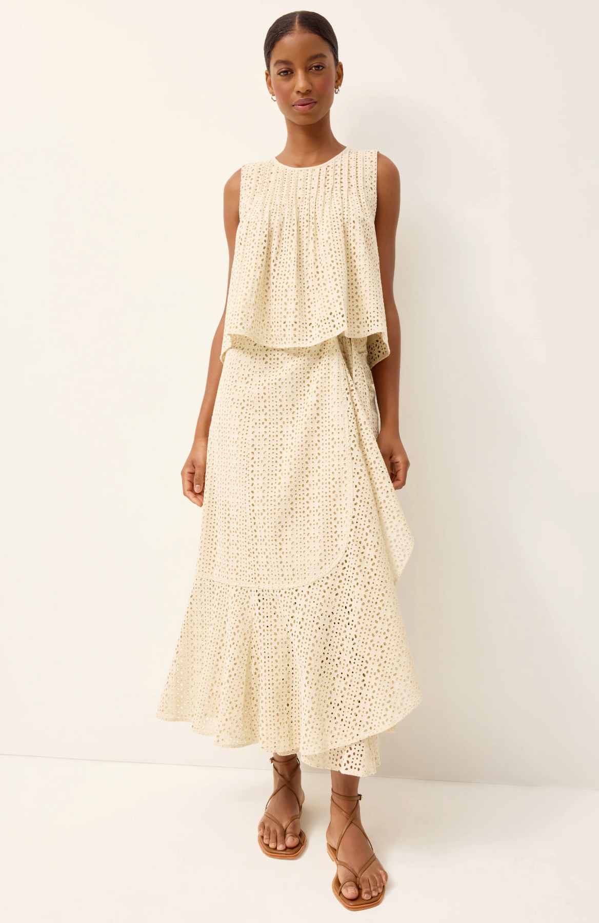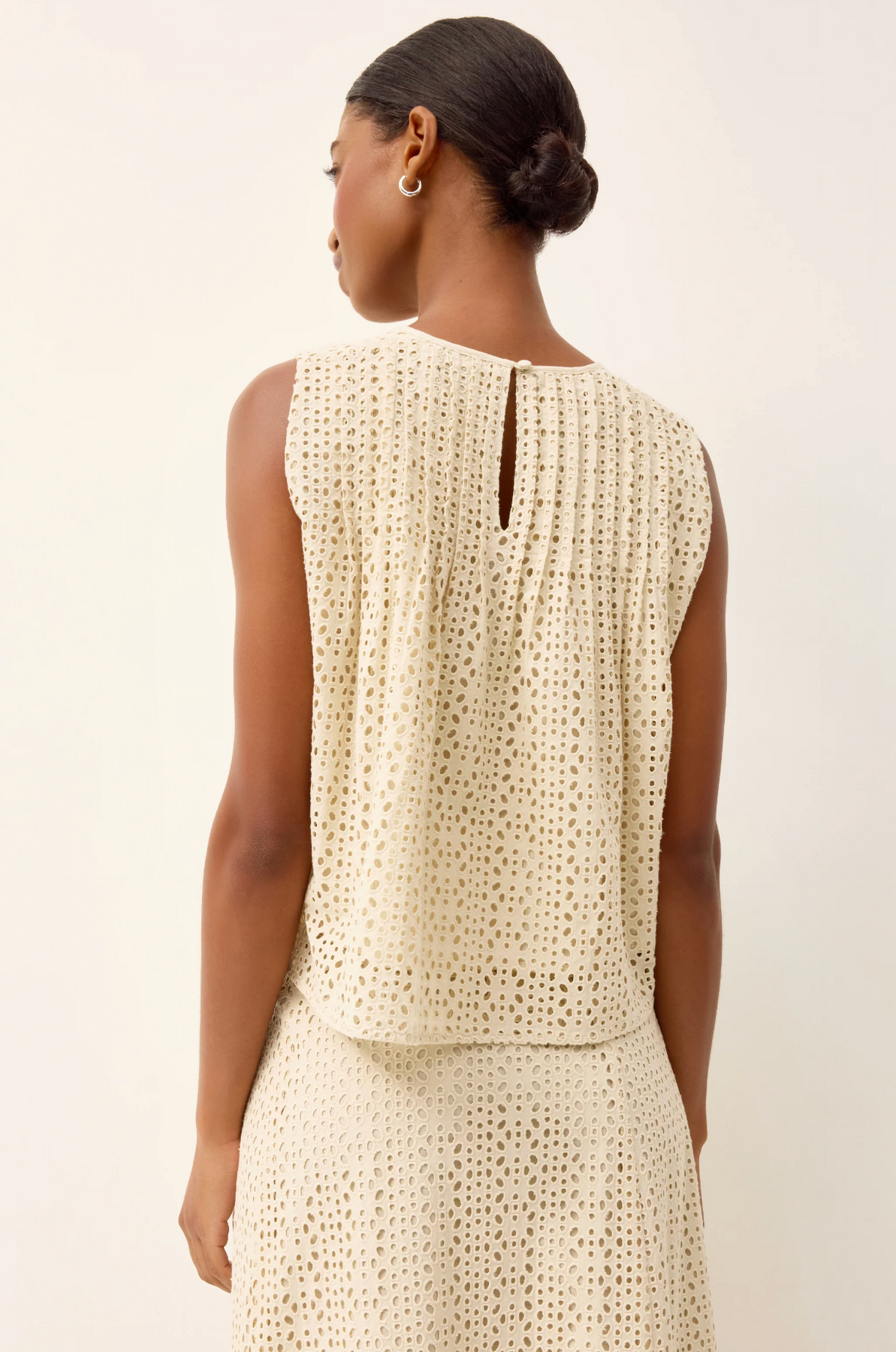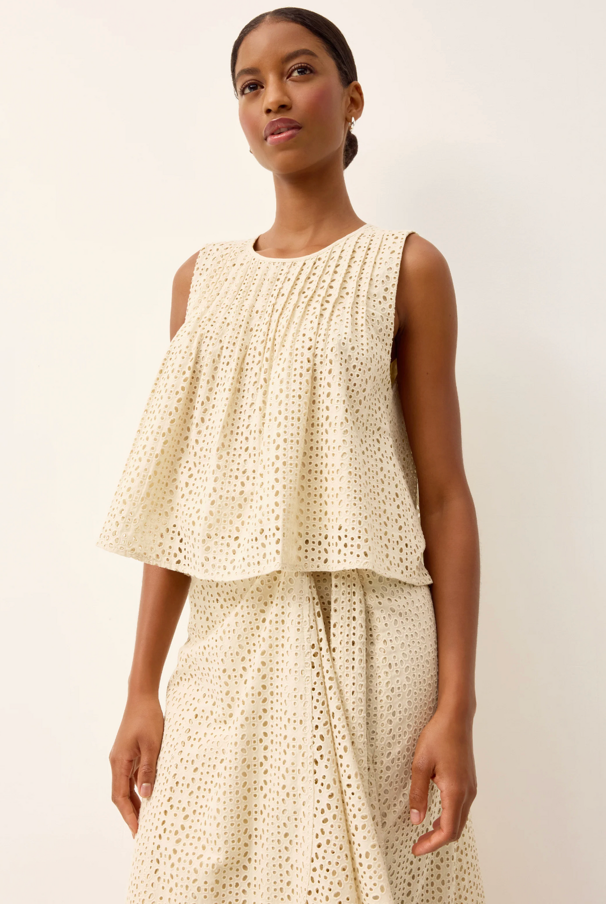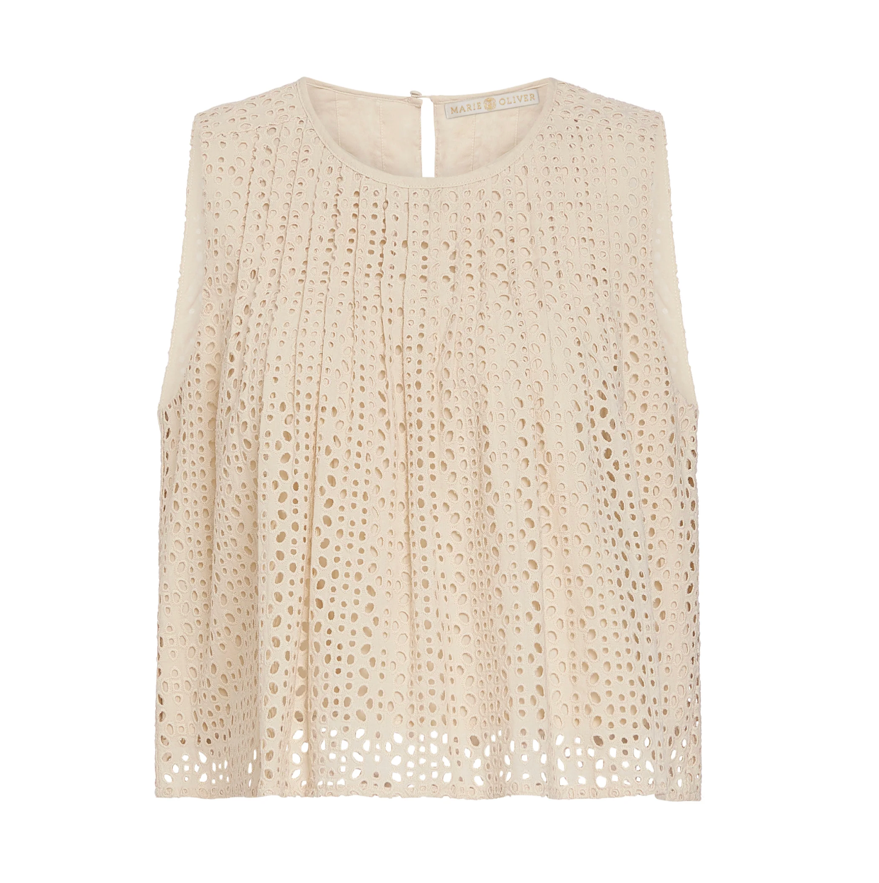 Letta is a fan favorite at Marie Oliver HQ. This easy swing top features delicate pintuck pleats and a flattering A-line shape that moves beautifully on the body. Rendered in neutral Dune eyelet, it adds sophisticated texture to your spring wardrobe.