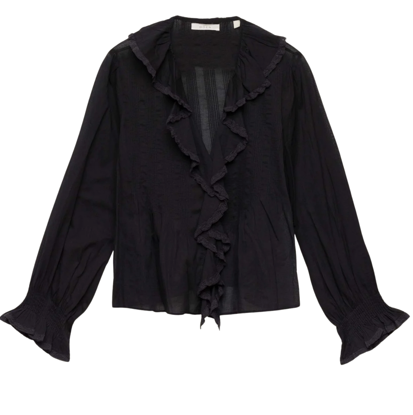 Crafted from the softest 100% organic cotton voile, the Hardy Top—a long-sleeved version of our beloved Henri Top—features a breezy cut, a plunging V-neckline framed with cascading lace-trimmed ruffles that extend down the bodice, hidden starburst buttons, and clustered pintucks at the yoke and back. Generous full-length sleeves finish in lace-trimmed ruffles at the cuffs. Wear it loose, or tuck it into your favorite high-waisted jeans.
