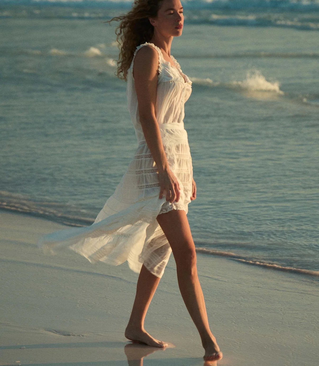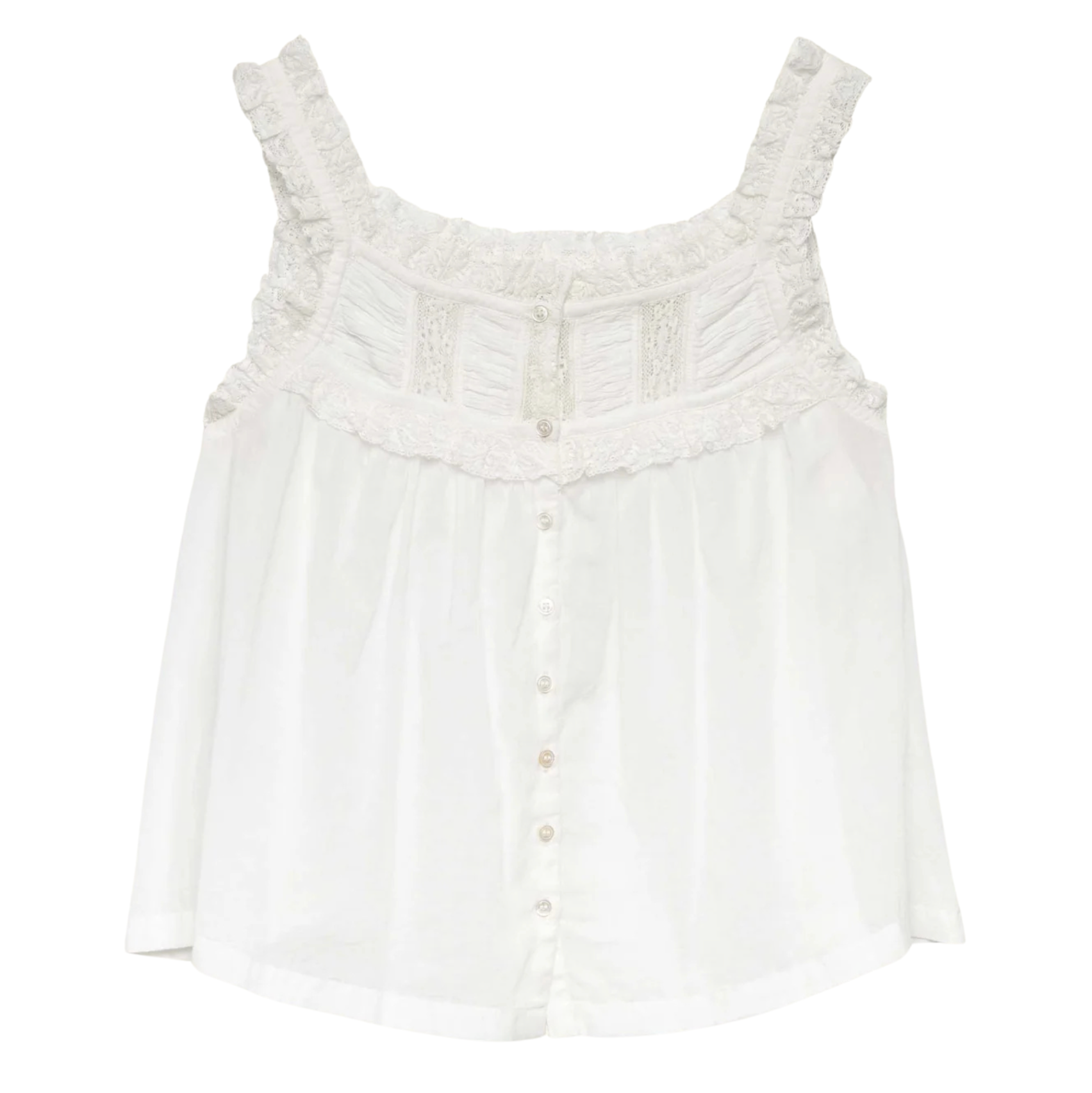 Taking cues from our beloved Frances Top—which we first designed in Spring 2019—the Fidella is a sleeveless top crafted from soft, lightweight organic cotton voile. The high square neckline is trimmed with ruffled lace, while a line of mother-of-pearl buttons extends down the center front. The yoke is adorned with alternating panels of ruching and inset lace. Leave it loose, or tuck it into your favorite pair of high-waisted jeans.