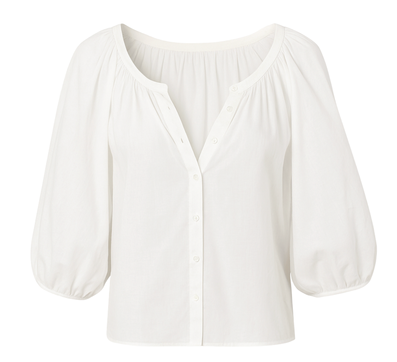 In the softest blend of organic cotton and viscose, the Jiana Top features a breezy silhouette and generous bracelet-length sleeves. Mother-of-pearl buttons extend down the center front. Wear it loose, or tuck it into your favorite high-waisted jeans.