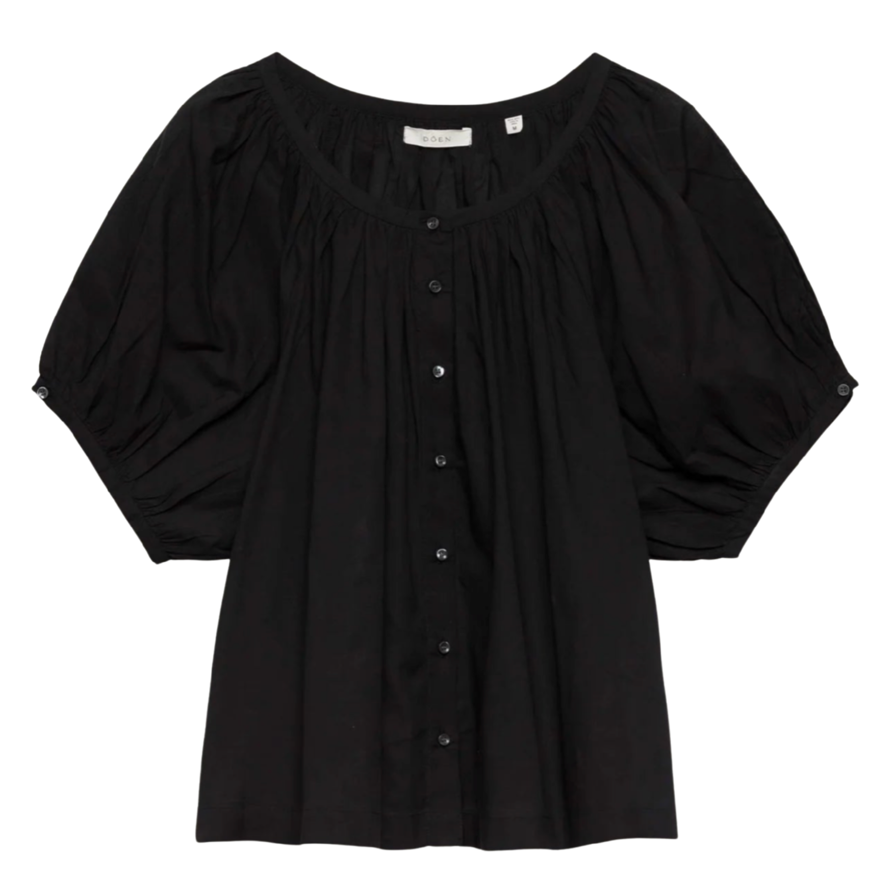 Crafted from a lightweight blend of organic cotton and viscose, the June Top is a short-sleeved take on our beloved Jane Blouse. It features a gathered scoop neckline, full raglan sleeves, and a relaxed, breezy cut. A line of mother-of-pearl buttons extends down the center front. Wear it loose, or tuck it into your favorite high-waisted jeans or shorts.